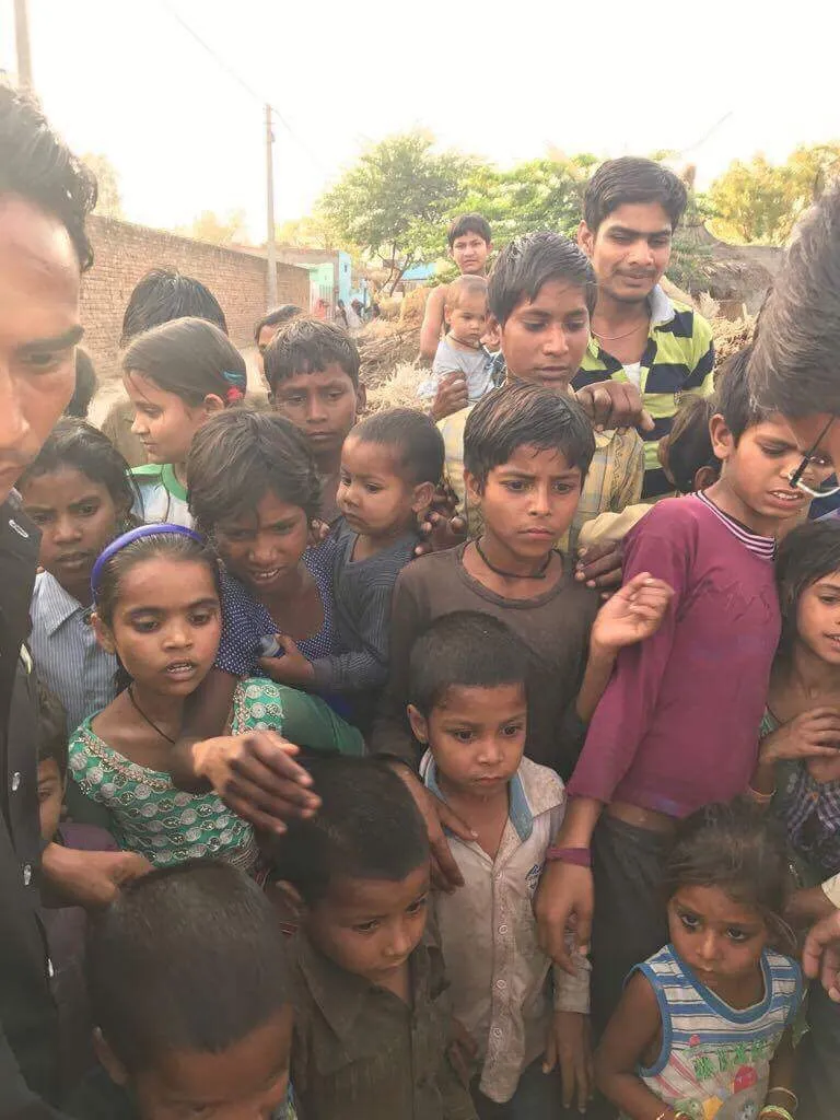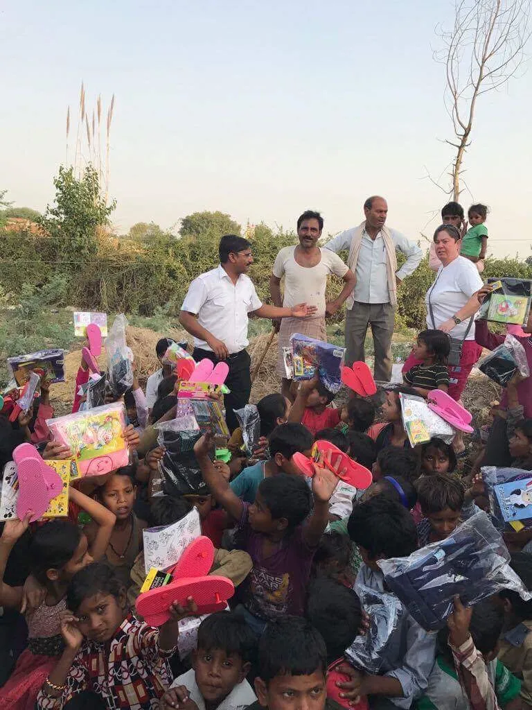 9. Given 165 bags of goodies 3 times (t-shirt, coloring books, crayons, toys and flip- flops to the village kids in a poor part of Mathura.